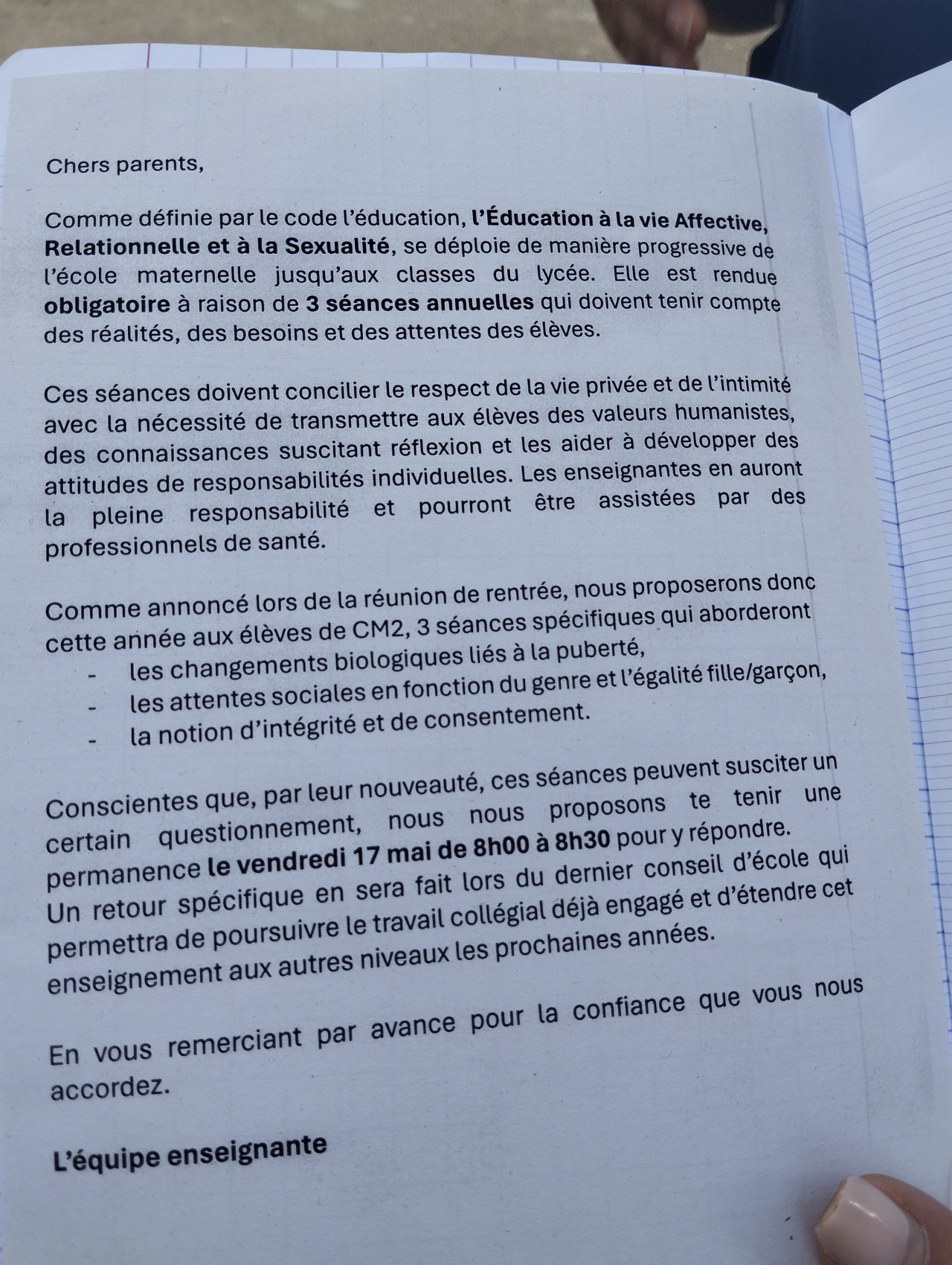 Photo prise le 30-05-2024 du courrier type annonçant une séance d'EAS mis sur le cahier de correspondance des élèves de CM2 d'une école primaire à Aix-en-Provence.