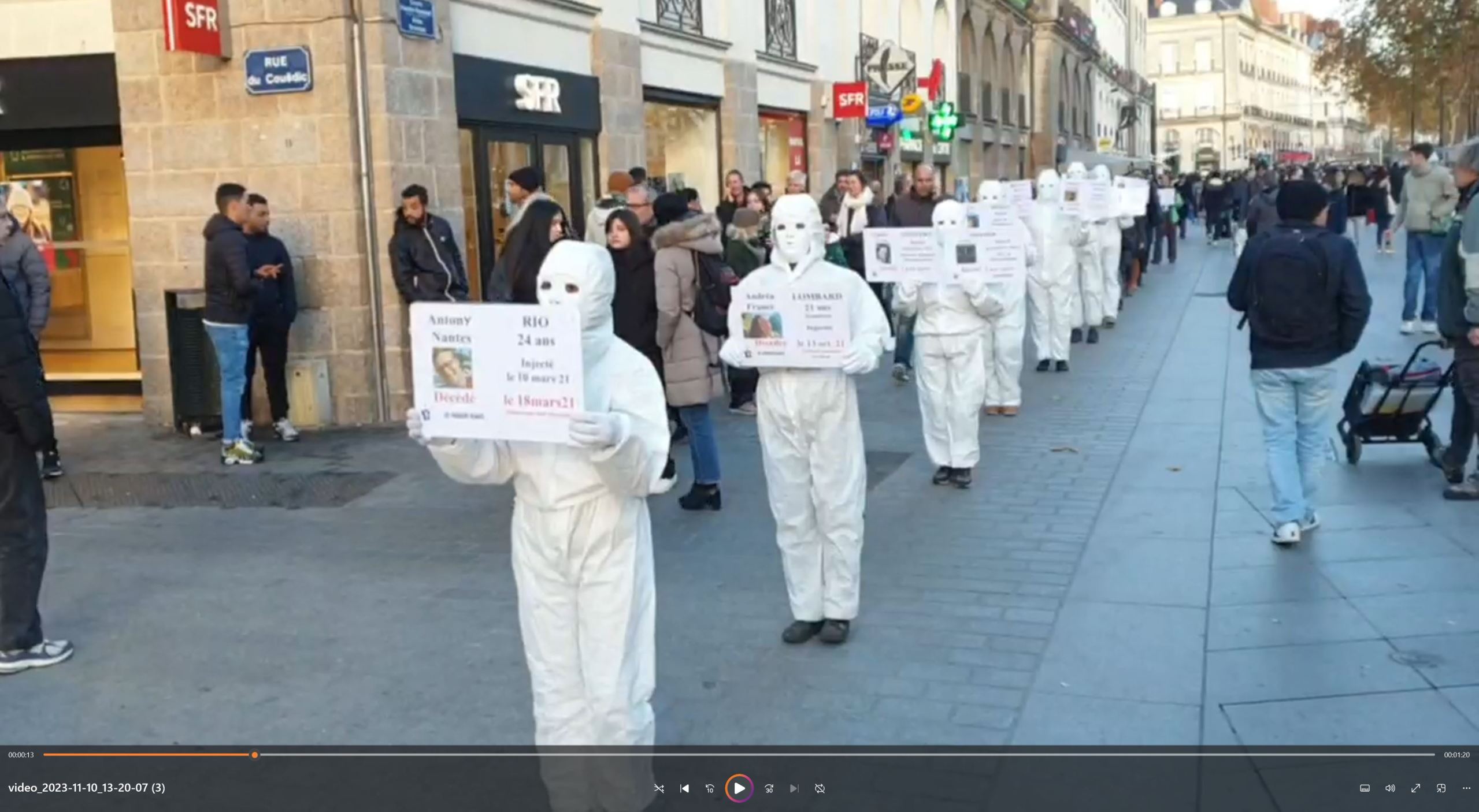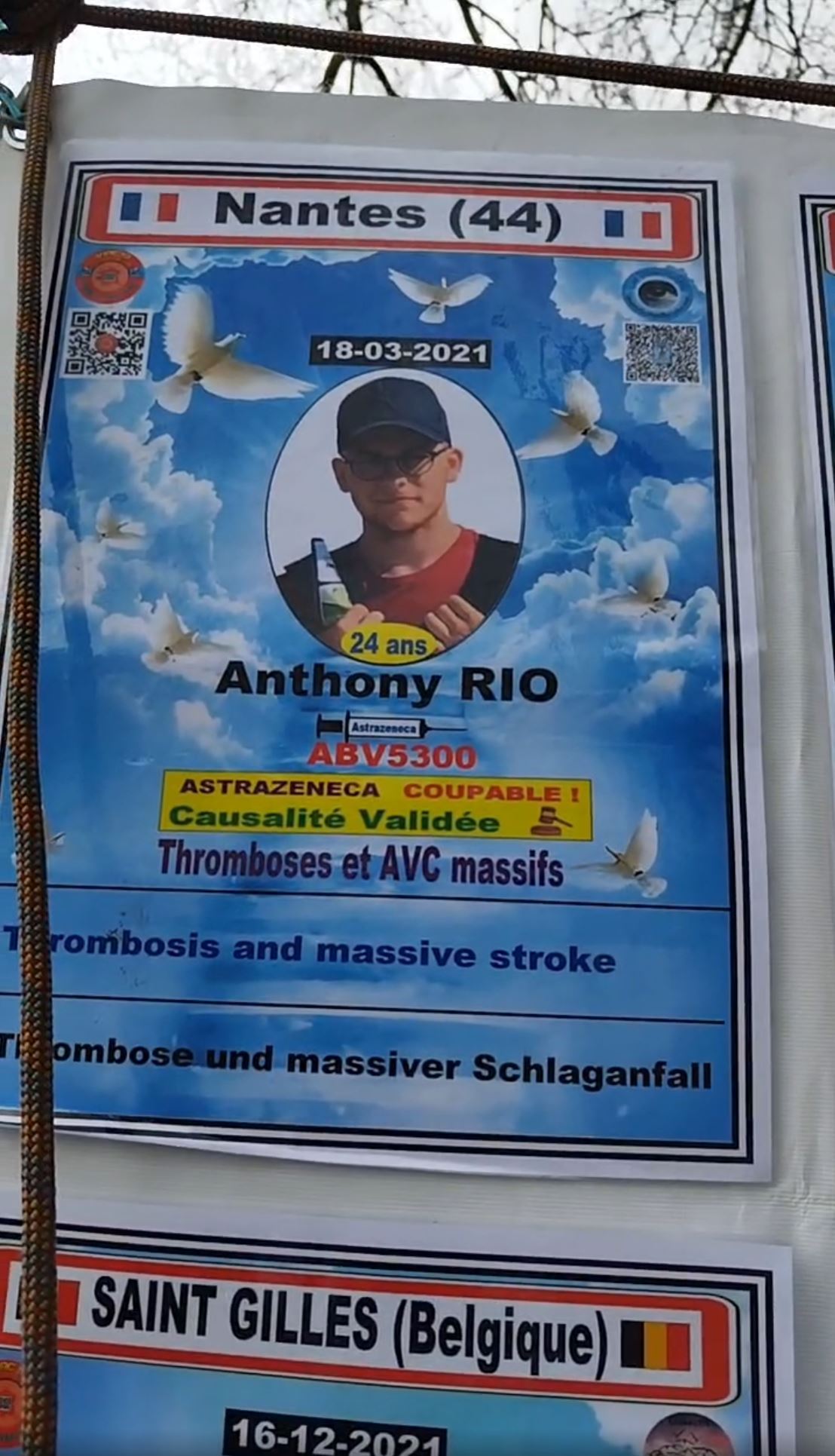 Cliquer sur les affiches pour vous mettre en lien avec les 4 vidéos des Masques Blancs pour un sitting à Nantes le 22-03-2025 sur les victimes des injections anti-covid et un hommage à Anthony RIO, décédé le 18-03-2021 suite à 1 injection AstraZeneca.