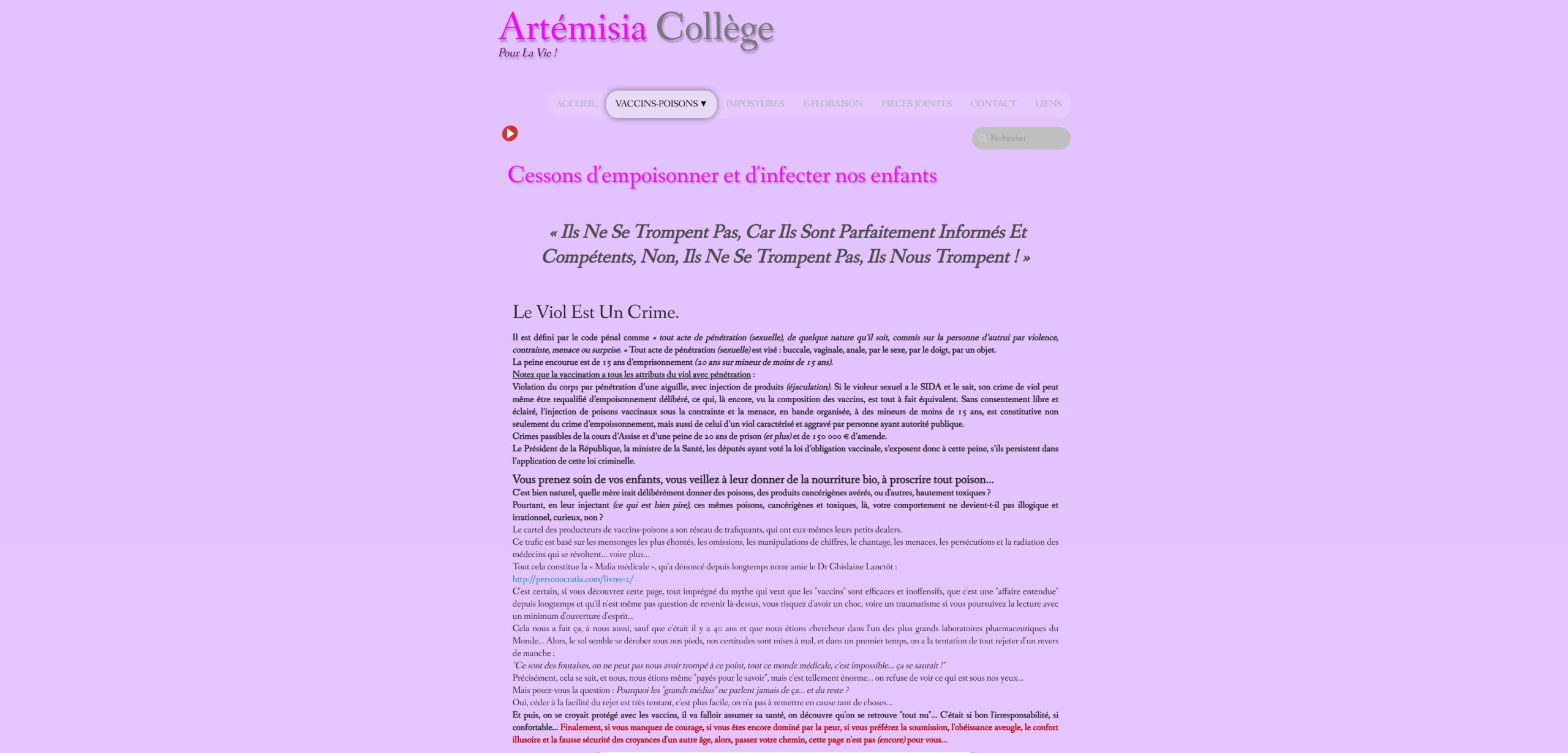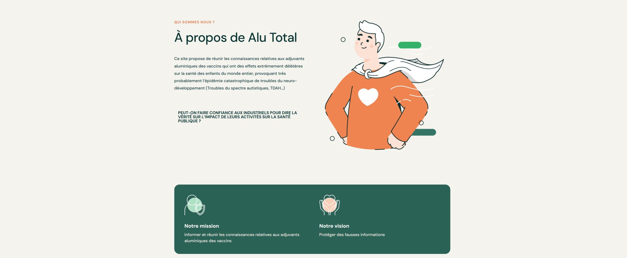 Cliquer sur l'affiche pour vous mettre en lien avec le site internet d'Alu Total qui propose de réunir les connaissances relatives aux adjuvants aluminiques des vaccins qui ont des effets extrêmement délétères sur la santé des enfants du monde entier, provoquant très probablement l’épidémie catastrophique de troubles du neuro-développement (Troubles du spectre autistiques, TDAH…).